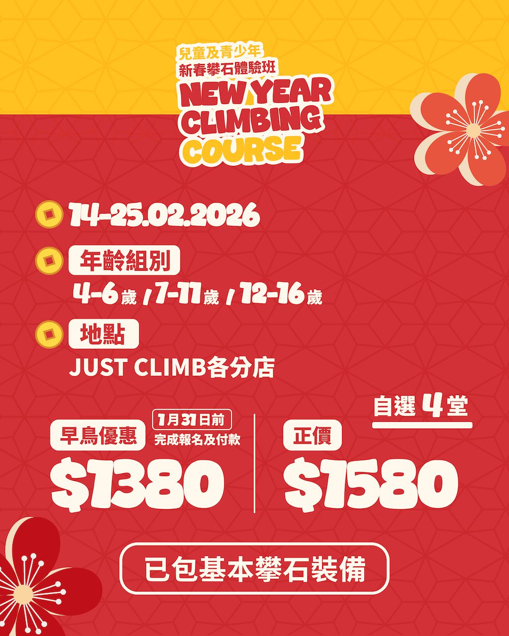 JUST CLIMB 推出全新的「新春攀石體驗班」,專為 4-16 歲兒童及青少年而設。攀石唔單止係體力訓練,更可以鍛煉孩子的專注力、觀察力同埋解難能力。